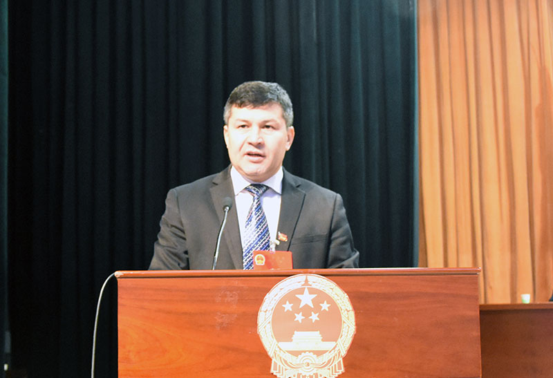 大会主席团成员陈健,巴.苏嘎,努尔买买提.吾买尔江,武振雷,阿斯哈提.赛提哈木扎,田增伟在主席台前排就座,县委副书记、县长黄希别克.努尔旦应邀出席会议。大会由执行主席巴.苏嘎主持。