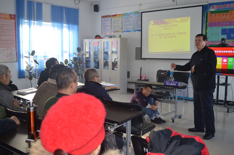 根据精河县大河沿子镇“农牧民夜校”集中送教活动安排,拜尔盖斯村驻村工作队积极筹备,2018年1月17日下午,以防震科普知识宣讲为重点的“十九大”宣讲活动如期走进拜尔盖斯村“农牧民夜校”。来自精河县宣讲团的精河县地震局局长齐建为大家上了一堂精彩的防震减灾科普知识课。全村党员、积极分子和部分村民共计35人参加了此次培训学习。