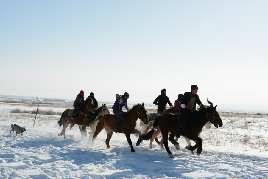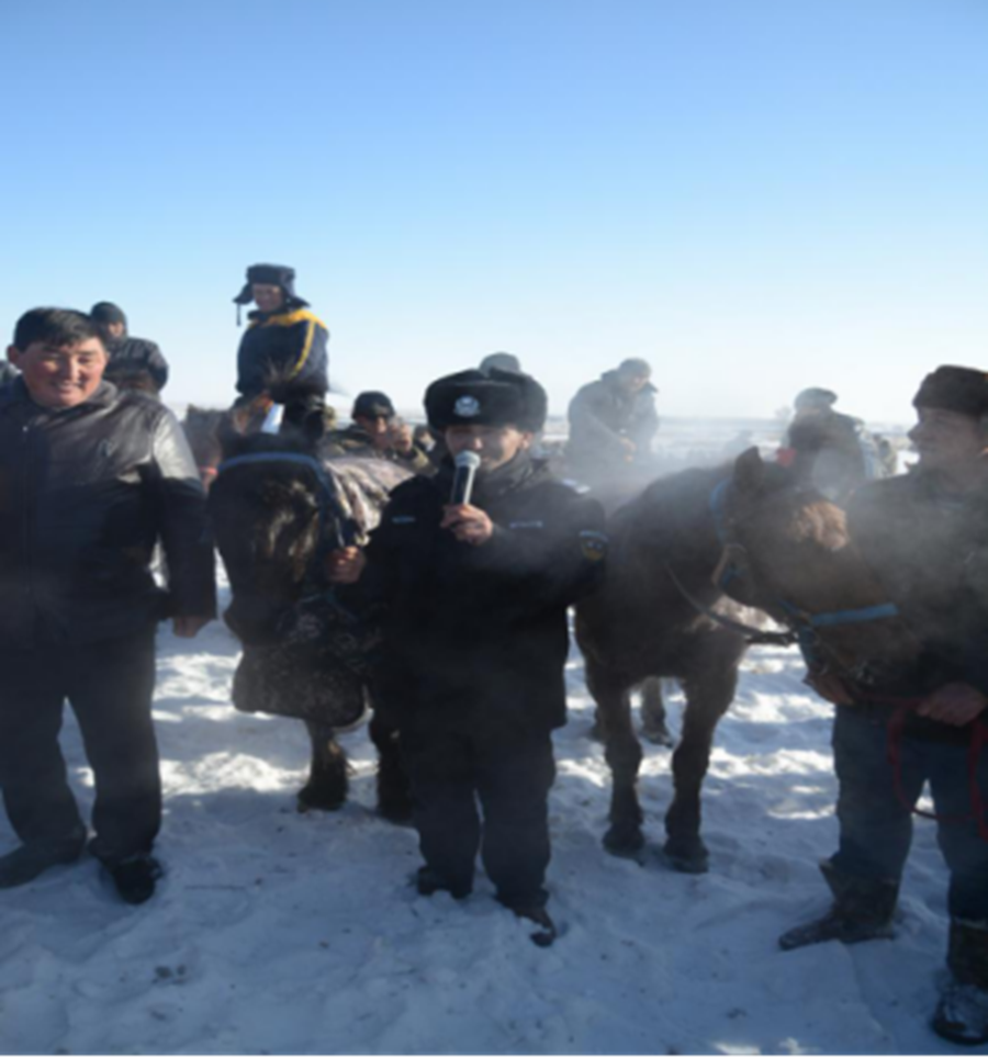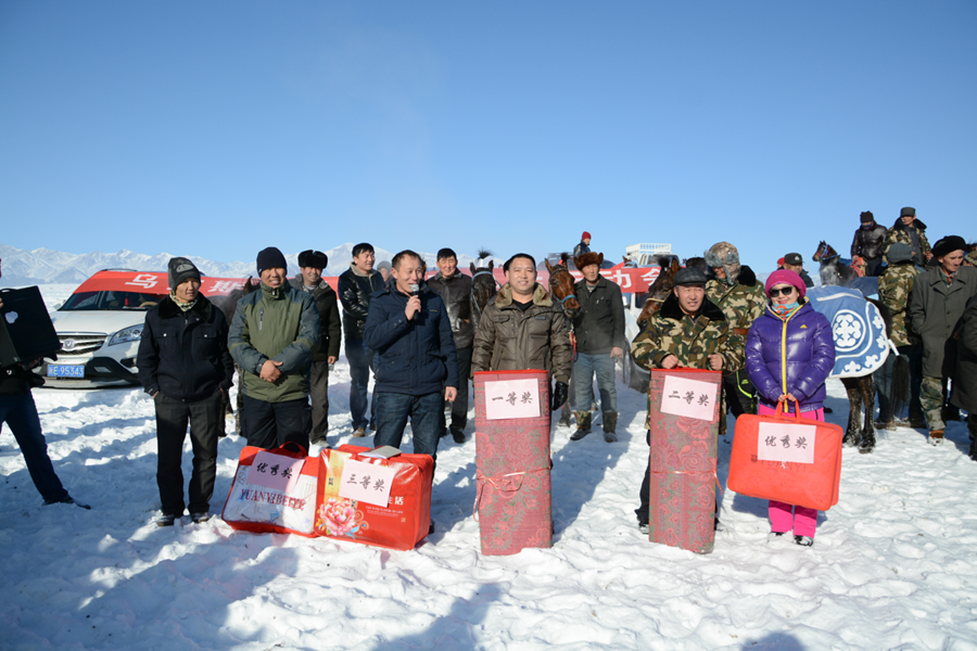 1月7日上午12:30,在村西3公里外的临时赛马场,赛马活动吸引了来自博乐市小营盘镇、温泉县呼合托哈种畜场、安格里格镇和本镇牧业村队的26名选手报名参赛。为满足广大牧民参与率,此次比赛只限博州本地马匹参赛。经过严格甄别审查,组委会确定了大马19匹,2岁小马16匹具有参赛资格。前来观看此次赛马活动的各族群众300余人。