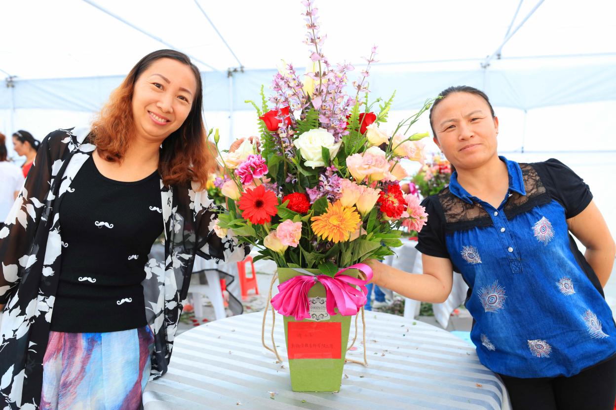 “插花比赛第一名在接受主持人的采访”