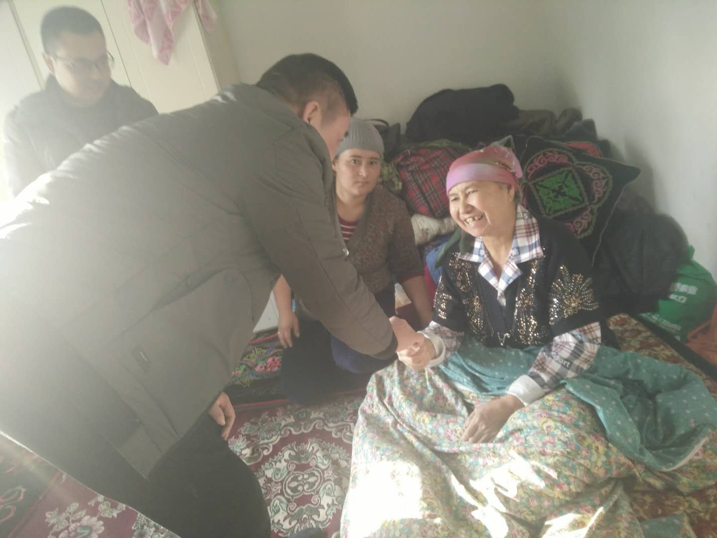 1月16日早晨,州供销社职工李振宏得知“民族团结一家亲”结亲贫困户,傲尔曼太的妻子江娜尔汗罹患严重肾病,没钱去医院治疗。得知这一情况后,李振宏十分牵挂“亲戚”情况,迅速前往达勒特牧村“亲戚”家中。一进门,李振宏就关切地询问江娜尔汗的病情,并送上面粉、清油等慰问品,以及1000元慰问金,叮嘱她尽快去医院治疗,祝愿早日康复。江娜尔汗的姐姐说:“这“亲戚”太好了!比我们自家亲戚还要好!我们的心好温暖。”